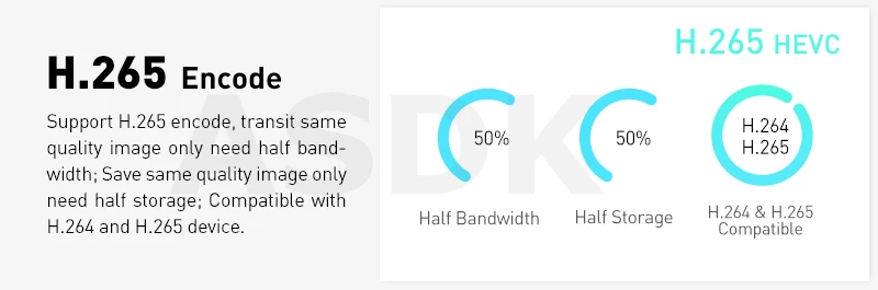 - Підтримка кодування H.265, порівнюючи з H.264, для передавання зображення тієї самої якості потрібно тільки половина смуги пропускання; для запису зображення тієї ж якості потрібно тільки половина сховища;
