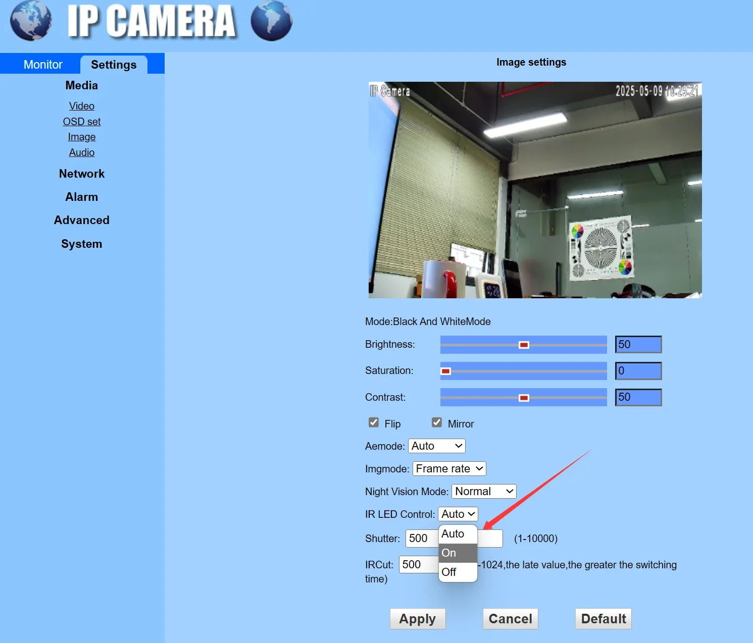 Ви можете вручну керувати перемиканням денного та нічного режимів камери через веб-інтерфейс камери, як показано на наступному малюнку. Натисніть на зображення нижче, щоб переглянути відеодемонстрацію.